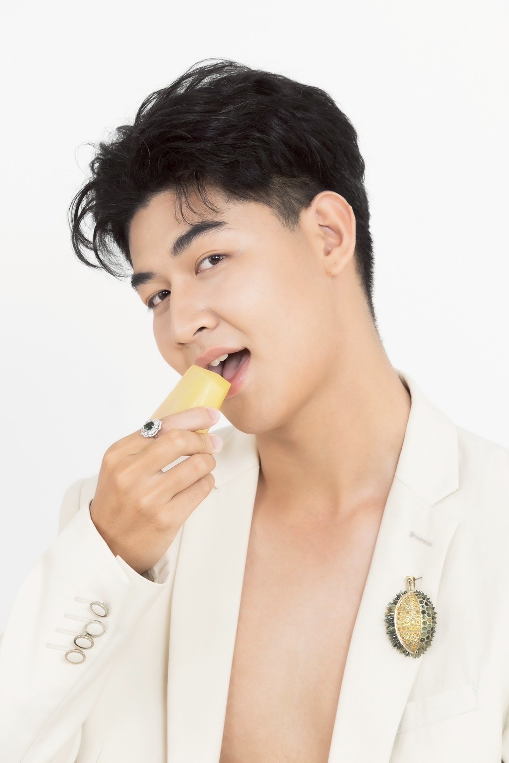 แรงบันดาลใจจากราชาแห่งผลไม้ไทย “ทุเรียน” ที่เปี่ยมด้วยคุณค่าและเป็นสัญลักษณ์แห่งความมั่งมี จี้ทุเรียนชิ้นนี้ถูกออกแบบให้หรูหราและมีความหมายลึกซึ้ง ด้วยการเลือกใช้ พลอยบุษราคัมแท้ เจียระไนงดงามมาเป็น “เนื้อทุเรียน” ซึ่งเปรียบได้กับความหวานของความสำเร็จ มั่นคงในชีวิต และโชคลาภที่สุกงอมพร้อมเก็บเกี่ยว